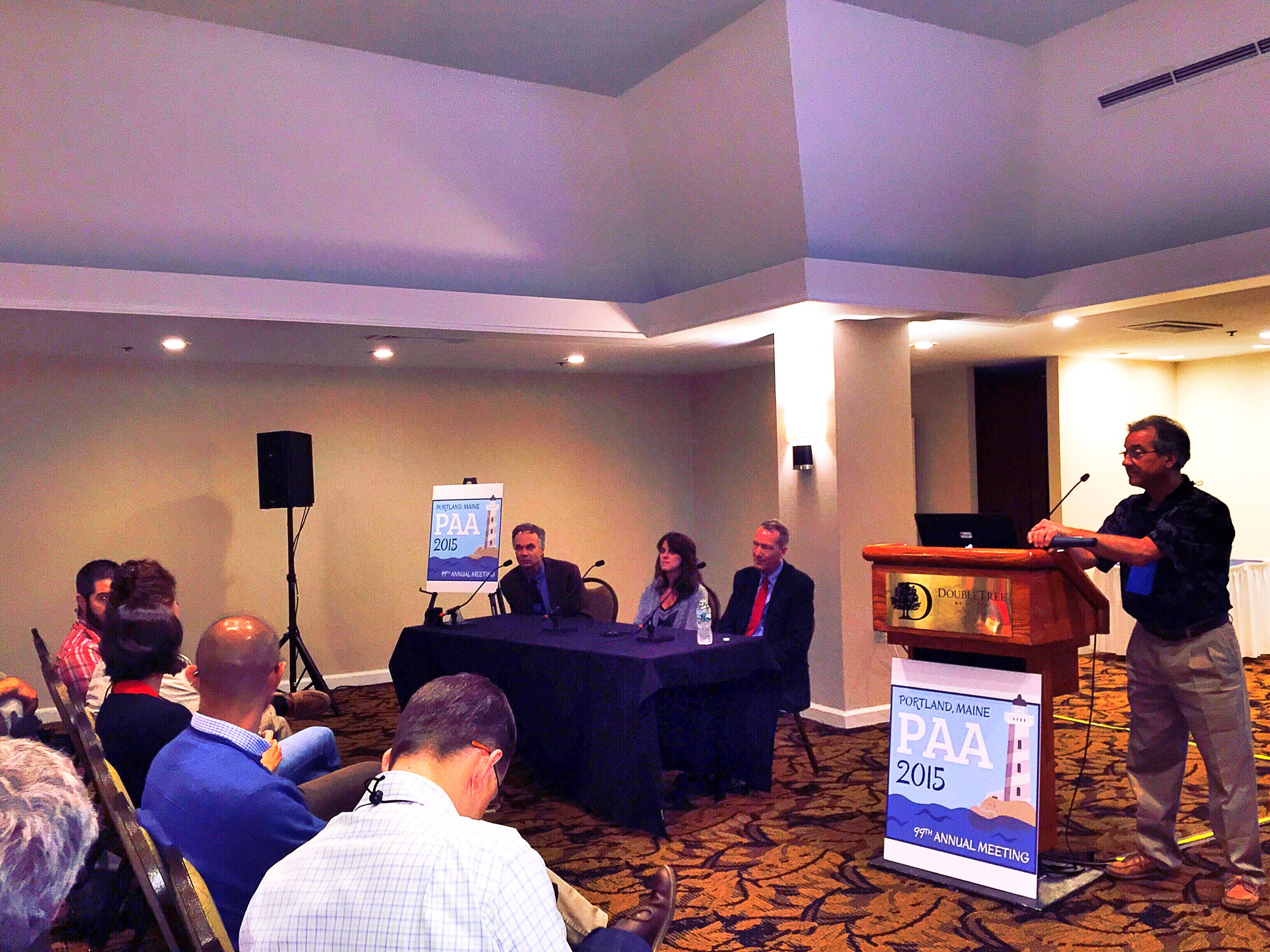 A symposium named Mitigation of Acrylamide: a Multidisciplinary Approach to an Industry Problem was held at the 2015 PAA annual meeting. Dr. Carl Rosen from U of Minnesota (left), Dr. Susie Thompson from North Dakota State U (middle), and Dr. Paul Bethke from U of Wisconsin-Madison were discussing with the audience about using agronomic, breeding approaches to reduce acrylamide level in potatoes made for French Fries.