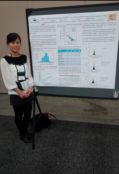 Dr. Yi Wang, UW-Madison Research Associate and Outreach Extension Specialist with SCRI-Acrylamide, presented a poster about NFPT/SCRI-Acrylamide project during the poster session, held by Potato Association of America, at the 2014 Potato Expo, San Antonio, TX.