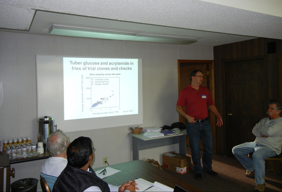 Dr. A.J. Bussan gave a talk about ongoing research and activities of NFPT/SCRI-acrylamide at the EGF meeting. Many representatives from the processing industry (McCain Foods, Simplot, ConAgra) as well as from the potato grower associations (WPVGA, Idaho Potato Commission) were in the audience.